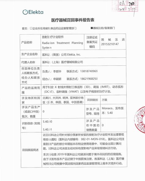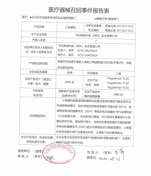 飛利浦金科威(深圳)實業有限公司報告,因產品配套使用的鋰電池在超過使用年限后可能會發生過熱或燃燒情況。飛利浦金科威(深圳)實業有限公司對其生產的心電圖機主動召回。召回級別為二級。涉及產品的型號、規格及批次等詳細信息見《醫療器械召回事件報告表》。