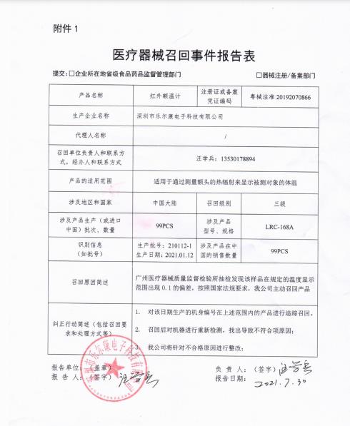 深圳市樂爾康電子科技有限公司報告,該公司對其生產的紅外額溫計實施主動召回處理,召回級別為三級,涉及產品的型號、規格及批次等詳細信息見《醫療器械召回事件報告表》。