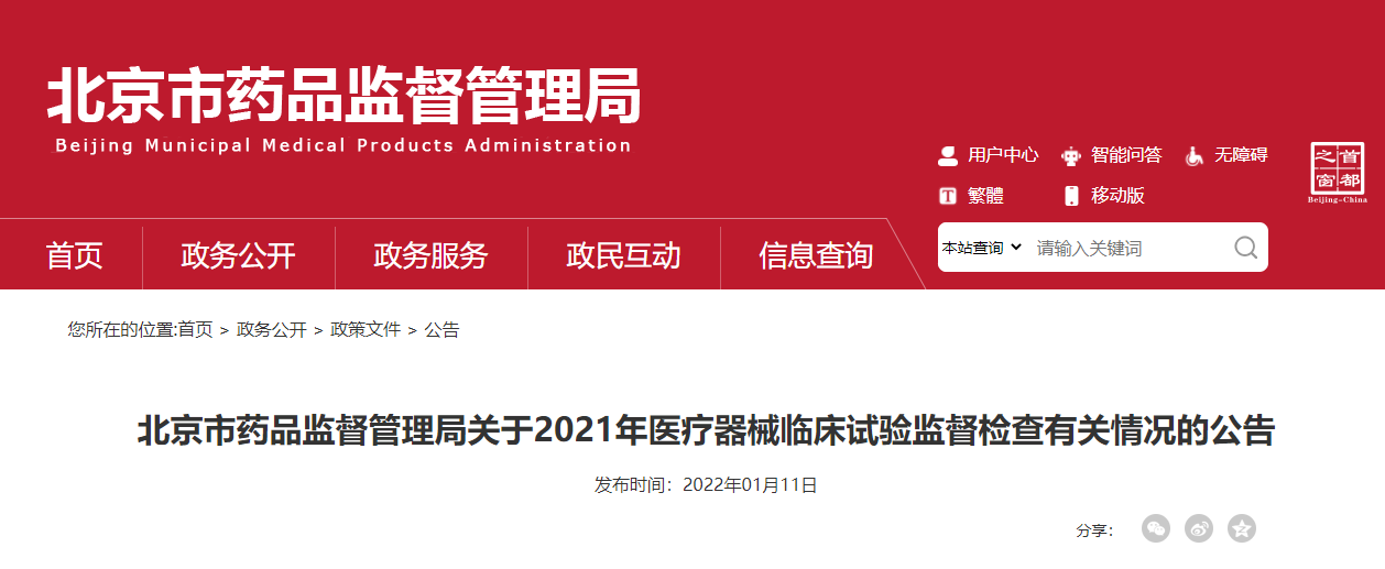 按照北京市藥品監督管理局、北京市衛生健康委員會《關于開展2021年醫療器械臨床試驗機構監督檢查的通知》(京藥監發〔2021〕131號)和北京市藥品監督管理局《關于發布2021年醫療器械臨床試驗監督抽查項目的通告》(通告〔2021〕2號)要求,2021年,我局對已在國家藥監局醫療器械臨床試驗機構備案管理信息系統進行備案的本市醫療器械臨床試驗機構開展了全覆蓋檢查,對5個已備案的醫療器械臨床試驗項目和涉及的11家臨床試驗機構開展了監督抽查,現將有關情況和處理結果公告如下: