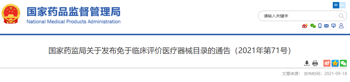 為做好醫療器械注冊管理工作,根據《醫療器械注冊與備案管理辦法》(國家市場監督管理總局令第47號),國家藥監局組織制定了免于臨床評價醫療器械目錄,現予發布,自2021年10月1日起施行。