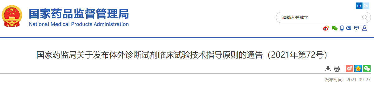為指導體外診斷試劑臨床試驗工作,根據《體外診斷試劑注冊與備案管理辦法》(國家市場監督管理總局令第48號),國家藥監局組織制定了《體外診斷試劑臨床試驗技術指導原則》(見附件),現予發布。該技術指導原則自發布之日起實施,原國家食品藥品監督管理總局發布的《體外診斷試劑臨床試驗技術指導原則》(原國家食品藥品監督管理總局通告2014年第16號)廢止。