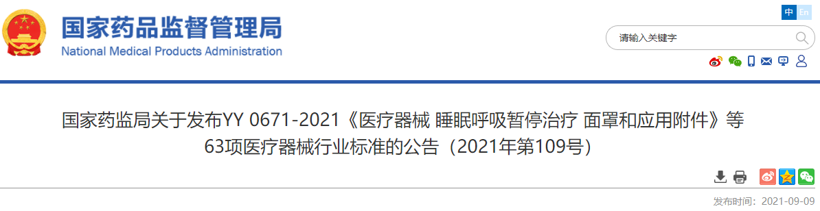 國家藥監局關于發布YY 0671-2021《醫療器械 睡眠呼吸暫停治療 面罩和應用附件》等 63項醫療器械行業標準的公告(2021年第109號)