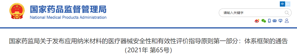 為加強醫療器械產品注冊工作的監督和指導,進一步提高注冊審查質量,國家藥品監督管理局組織制定了《應用納米材料的醫療器械安全性和有效性評價指導原則第一部分:體系框架》,現予發布。