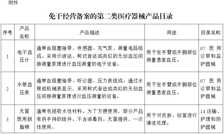 為貫徹實施《醫療器械監督管理條例》,國家藥監局組織制定了《免于經營備案的第二類醫療器械產品目錄》,具體產品見附件。現予以公布。