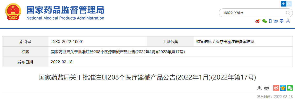 2022年1月,國家藥品監督管理局共批準注冊醫療器械產品208個。其中,境內第三類醫療器械產品151個,進口第三類醫療器械產品21個,進口第二類醫療器械產品33個,港澳臺醫療器械產品3個(具體產品見附件)。特此公告。