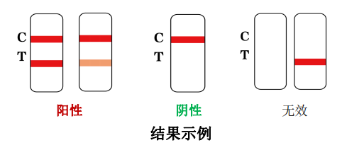陽性:兩條紅色或紫色條帶出現。一條位于檢測區(T)內,另一條位于質控區(C)內。檢測區(T)條帶顏色可深可淺,均為陽性結果。