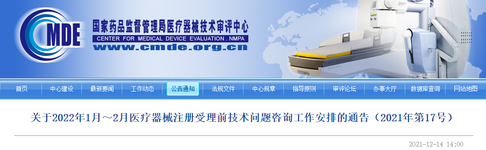 關于2022年1月~2月醫療器械注冊受理前技術問題咨詢工作安排的通告(2021年第17號)