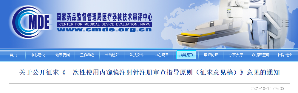 我中心結合境內、境外醫療器械注冊申報產品的特點及申報現狀,在總結技術審評實際情況,并參考相關文獻資料的基礎上,起草了《一次性使用內窺鏡注射針注冊審查指導原則(征求意見稿)》。