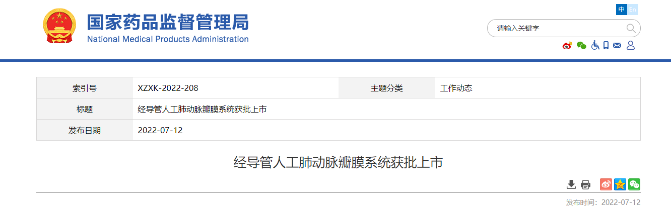 近日,國家藥品監督管理局經審查,批準了杭州啟明醫療器械股份有限公司生產的創新產品“經導管人工肺動脈瓣膜系統”注冊。