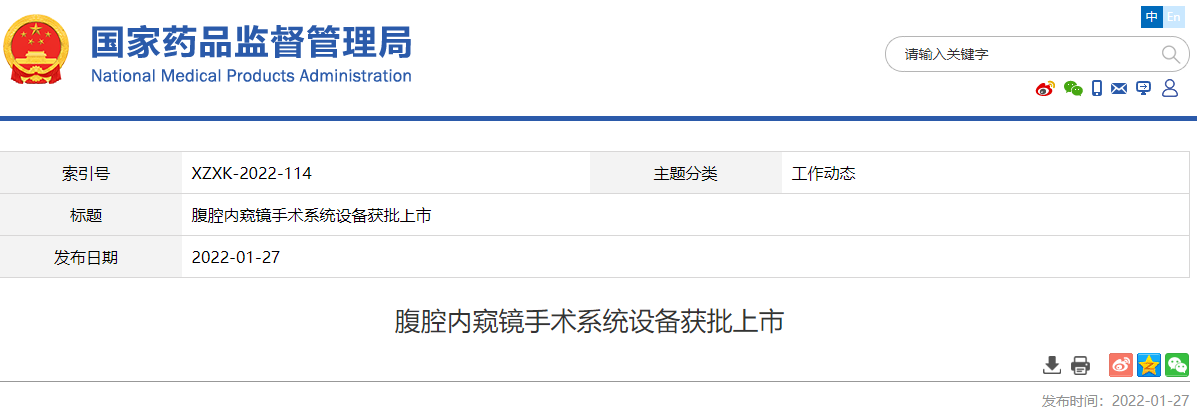 近日,國家藥品監督管理局經審查,批準了上海微創醫療機器人(集團)股份有限公司生產的創新產品“腹腔內窺鏡手術系統”的注冊申請。