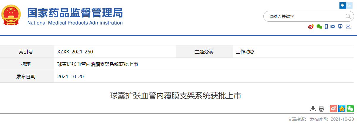 近日,創新醫療器械球囊擴張血管內覆膜支架系統獲批上市