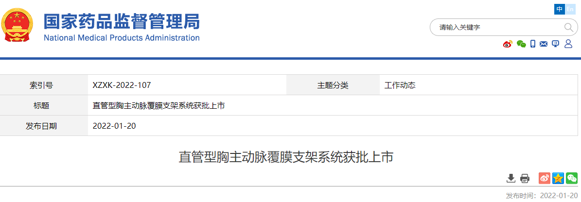 近日,國家藥品監督管理局經審查,批準了上海微創心脈醫療科技(集團)股份有限公司生產的創新產品“直管型胸主動脈覆膜支架系統”注冊。