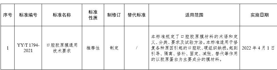 YY/T 1794-2021《口腔膠原膜通用技術要求》醫療器械行業標準已經審定通過,現予以公布。標準編號、名稱、適用范圍、實施日期見附件。