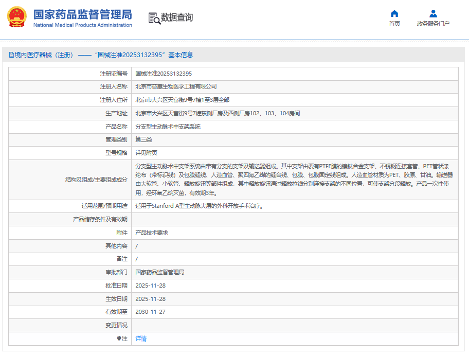 近日,國家藥品監督管理局批準了北京市普惠生物醫學工程有限公司分支型主動脈術中支架系統創新產品注冊申請。