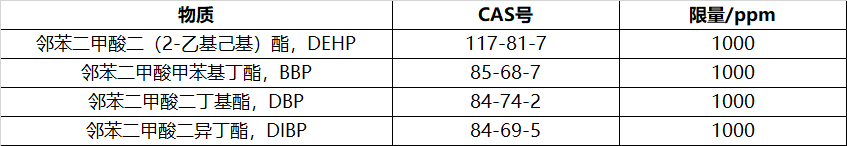 新增的4項鄰苯二甲酸酯及限量如下: