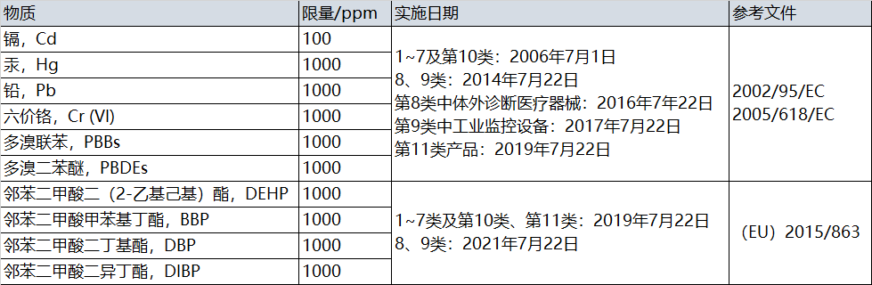 1) 2019年7月22日起,所有輸歐電子電氣產品(除醫療和監控設備)均需滿足該限制要求;