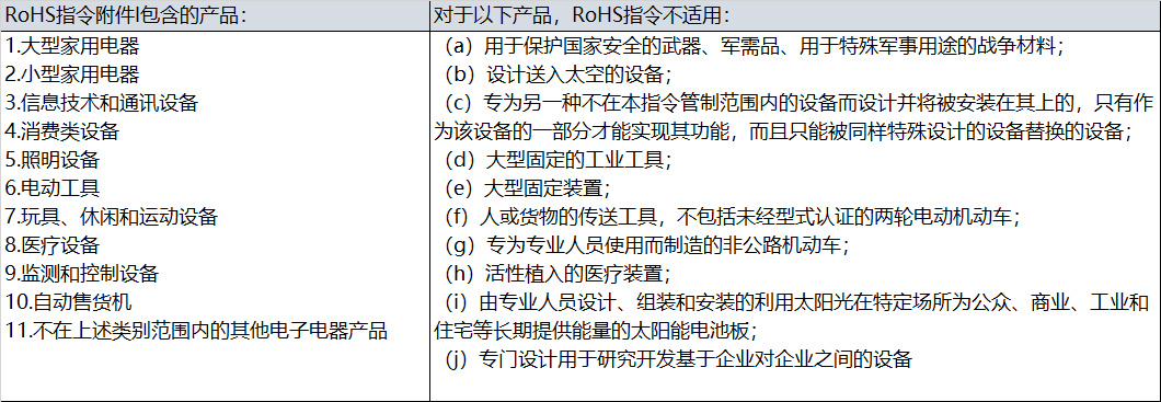 RoHS指令涉及的產品范圍相當廣泛,幾乎涵蓋了所有電子、電器、醫療、通信、玩具、安防信息等產品,它不僅包括整機產品,而且包括生產整機所使用的零部件、原材料及包裝件,關系到整個生產鏈。指令附件I中列出了該指令覆蓋的電子電氣設備范圍: