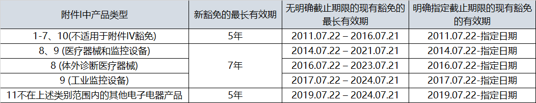 需要注意的是,豁免不是一直都有效的,RoHS豁免的每一條款都有相應的有效期。企業需實時關注RoHS豁免的最新動態,注意更換產品中已失效的豁免材料。以下是豁免截止期限明細: