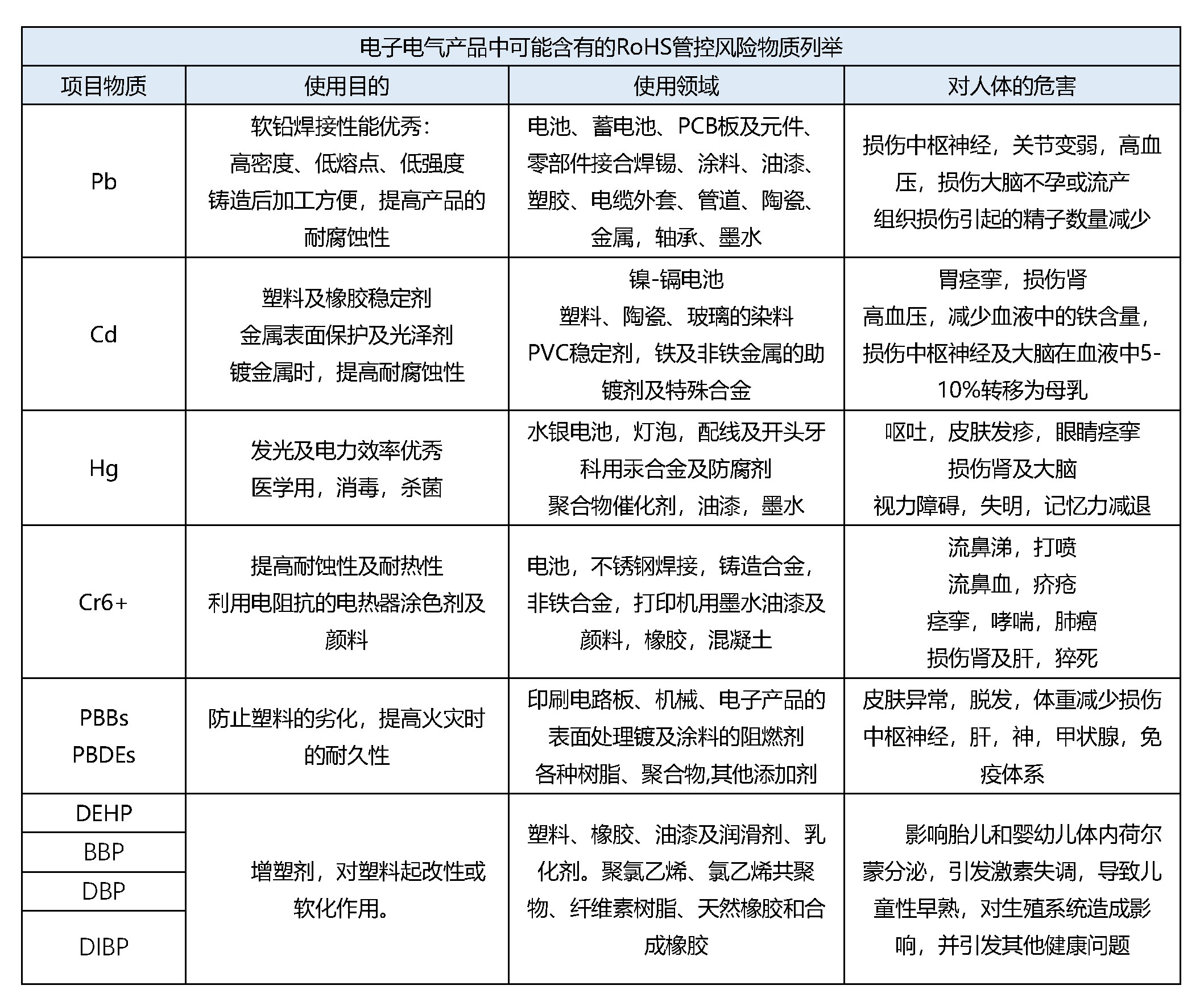 電子電氣產品中可能含有的RoHS管控風險物質列舉: