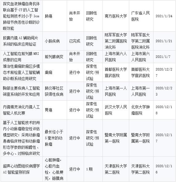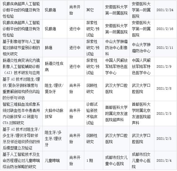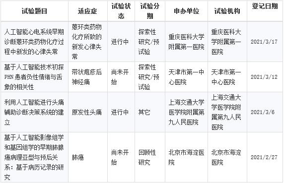 目前人工智能醫療器械的臨床試驗也在逐步開展,以下為部分人工智能醫療器械臨床試驗匯總情況(數據來源于藥智數據)。