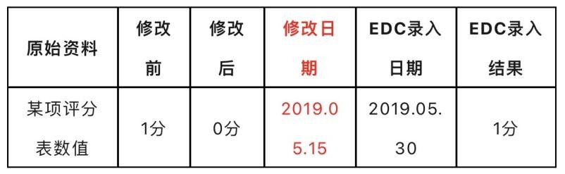 案例重現:如下圖,原始資料中示該數據于2019.05.15修改,EDC錄入日期為2019.05.30,但仍錄入修改前的錯誤數據。若該問題被稽查人員發現了,回簽行為實錘。不知道多少人關注過EDC中數據的操作痕跡,如果你去看看EDC的操作痕跡,你就會發現數據修改日期存在回簽現象。