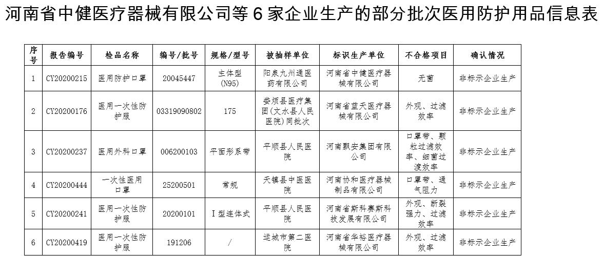 我局在2020年醫療器械質量抽檢中,抽取標示為河南省中健醫療器械有限公司生產的醫用外科口罩;河南協和醫療器械制品有限公司生產的一次性醫用口罩;河南華裕醫療器械有限公司生產的醫用一次性防護服;河南飄安集團有限公司生產的醫用外科口罩;河南斯科塞斯科技發展有限公司生產的一次性防護服;河南省藍天醫療器械有限公司生產的醫用一次性防護服。詳細信息見附件。上述產品經山西省醫療器械檢測中心檢驗,部分項目不符合標準規定。經我局協查河南省藥品監督管理局回函確認,全部為非標示企業生產,存在重大質量安全風險。抽樣地藥品監督管理部門正在進行立案調查。