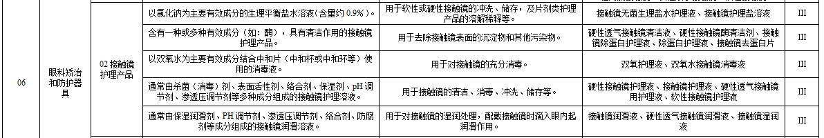 根據《醫療器械分類目錄》,接觸鏡護理產品的分類編碼為16-06-02,屬于第三類醫療器械管理,根據其功能的差異被細分為五大類。