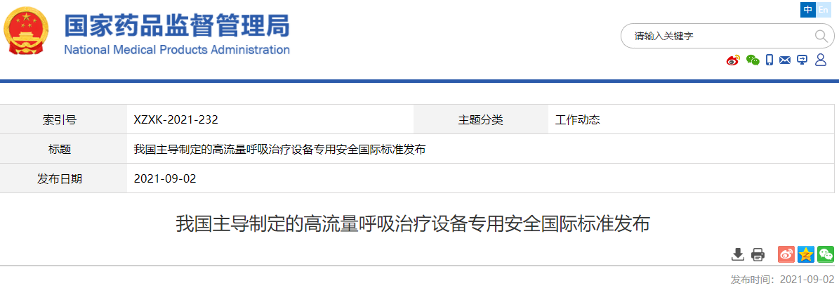 2021年8月30日,國際標準《醫用電氣設備 第2-90部分:高流量呼吸治療設備的基本安全和基本性能專用要求》,由國際標準化組織(International Organization for Standardization,ISO)和國際電工委員會(International Electrotechnical Commission,IEC)官網發布(標準號:ISO 80601-2-90:2021),這是由我國提出并負責完成的首個新冠肺炎疫情防控醫療器械國際標準項目。