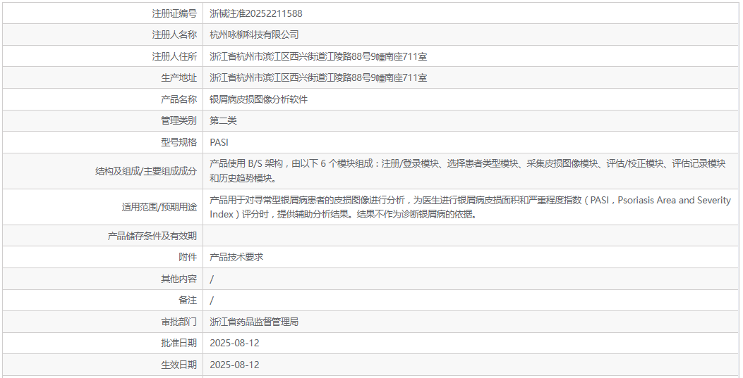 20250812日,杭州詠柳科技有限公司的銀屑病皮損圖像分析軟件PASI)獲批上市。該產品是行業首個基于人工智能算法的銀屑病皮損圖像分析軟件,為銀屑病的精準化診療帶來了全新助力。