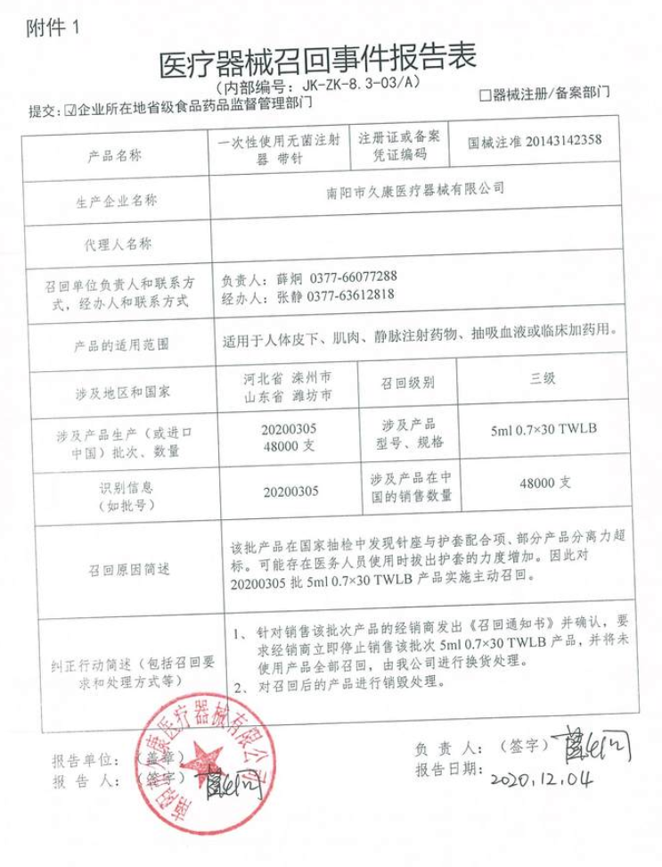 南陽市久康醫療器械有限公司報告,由于其生產的一批次一次性使用無菌注射器帶針針座與護套配合不符合標準,企業對其主動召回,召回級別為三級。召回產品的型號、規格及批次等詳細信息見《醫療器械召回事件報告表》。
