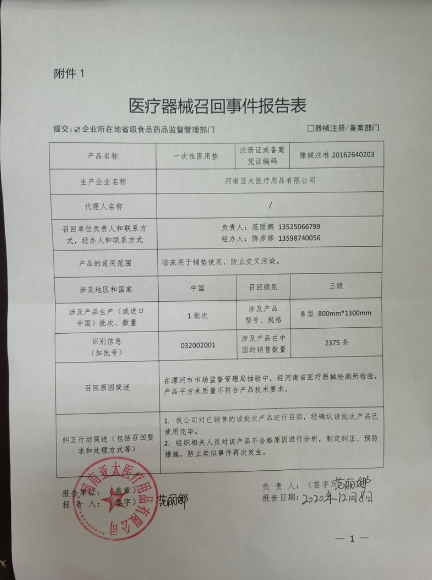 河南亞太醫療用品有限公司報告,由于其生產的一批次一次性醫用墊平方米質量不符合規定,企業對其主動召回,召回級別為三級。召回產品的型號、規格及批次等詳細信息見《醫療器械召回事件報告表》。