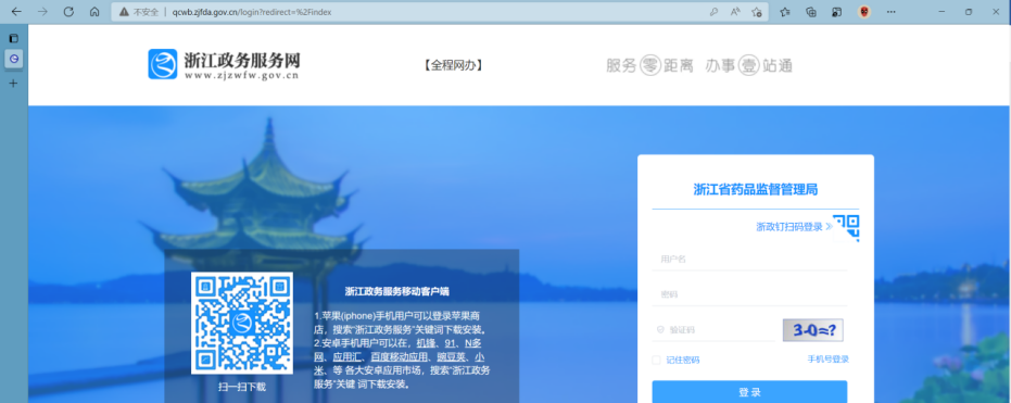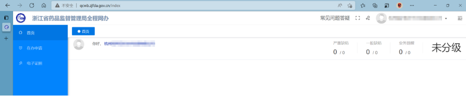 使用原浙江省藥品監督管理局行政審批系統的賬號密碼登錄,全程網辦系統不需要使用UKey識別賬號登錄,可直接輸入賬號以及密碼登錄系統。大多數企業賬號為SQ或JQ開頭的,如SQ33000001。若使用原密碼登錄提示密碼錯誤的,可將賬號作為密碼嘗試是否能登入系統,如賬號:SQ33000001,密碼:SQ33000001。如果還是登錄不了系統,可電話0571-88903259,或qq1611607245、3148183981聯系查詢賬號密碼。登入系統后界面如下。