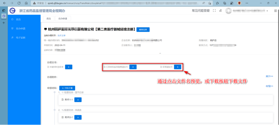 點擊“查看”按鈕進入辦件詳情頁,在此界面就可查看/下載相應的受理通知書或者繳費通知書。