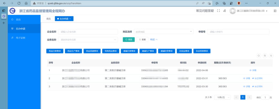 點擊左側菜單【在辦申請】進入查看當前申報的辦件,列表會展示當前正在辦理的所有企業申請,通過點擊詳情進入查看。