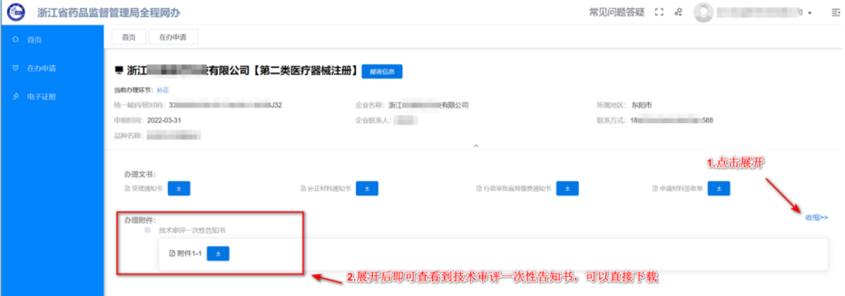 通過點擊“詳情”按鈕進入查看或下載《技術審評一次性告知書》。