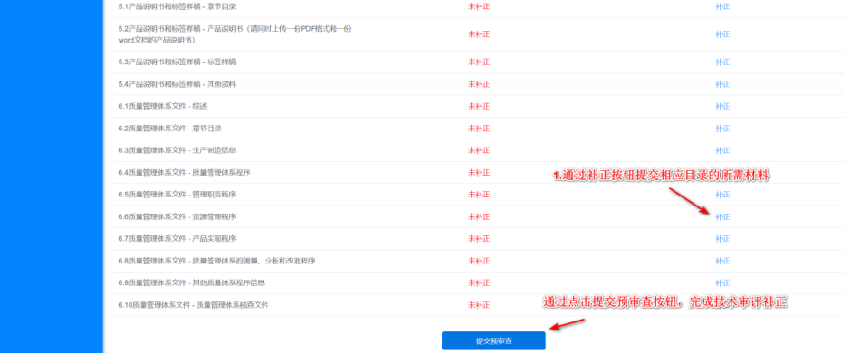 補正材料準備好之后,可登錄系統在【在辦申請】菜單,通過點擊“補正材料”按鈕進入材料提交頁,通過點擊各目錄右側“補正”按鈕提交相應文件材料,待材料全部上傳完成后,點擊頁面下方“提交預審查”按鈕將電子資料上報給主審。