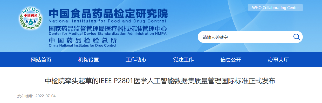 2022年7月1日,電氣電子工程師學會(IEEE)標準協會傳來喜訊:我院牽頭的IEEE P2801 “Recommended Practice for the Quality Management of Datasets for Medical Artificial Intelligence醫學人工智能數據集質量管理”國際標準正式發布實施,成為人工智能醫療器械領域的首個全球性標準。該標準由我院提出,在2018年12月正式獲批立項。同時,我院牽頭組成IEEE人工智能醫療器械標準工作組,包括國內外十余家從事人工智能醫療器械生產、研發、測試、監管等工作的單位成員。工作組秉承開放創新、團結進取的精神,具體投入了四十多名專家參與編寫和討論。歷經三年多的努力和多次的修改完善,標準草案在今年5月13日正式獲得IEEE標準協會的批準。本標準在起草階段獲得了國際社會的廣泛關注,被多個國家、地區的人工智能政策文件引用。IEC TC62技術委員會也派出部分專家參與討論。