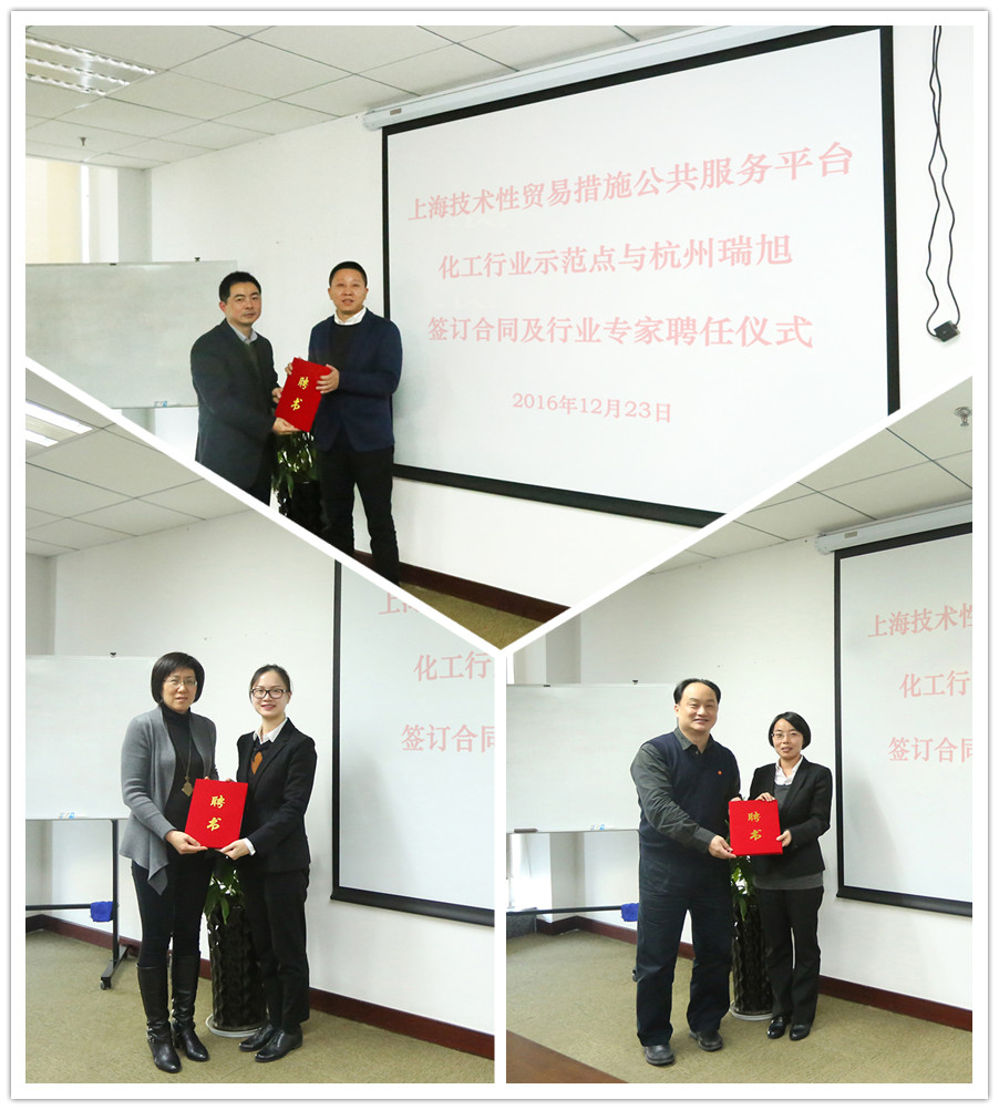 為進一步做好2017年中國WTO/TBT-SPS國家通報咨詢中心化學品研究評議基地工作,協助推動國內的化學品相關行業企業更有效地應對國外技術性貿易措施的影響,上海技術性貿易措施公共服務平臺與瑞旭技術正式簽約,并向瑞旭技術的三位法規專家,副總經理林隆海先生,研發部副經理楊麗波女士,危化合規主管潘晶瑾女士發放聘書,正式聘請瑞旭技術的法規人才,作為評議專家直接參與到技術性貿易措施評議工作中。