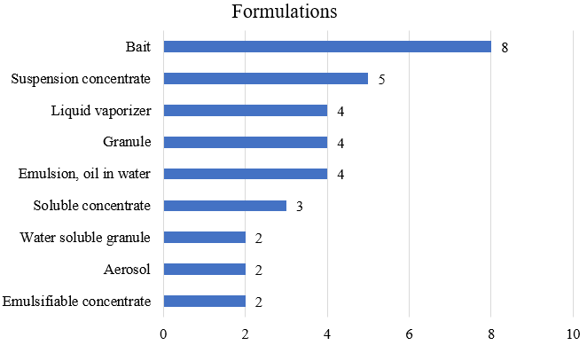 When examining the registered formulation types for public health pesticides, bait and suspension formulations are the predominant formulation types.