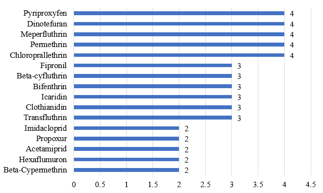 The figure below highlights the top three active ingredients for newly registered public health pesticides in 2023. These active ingredients garnered the highest number of registrations: