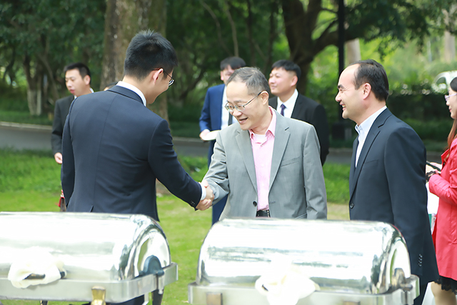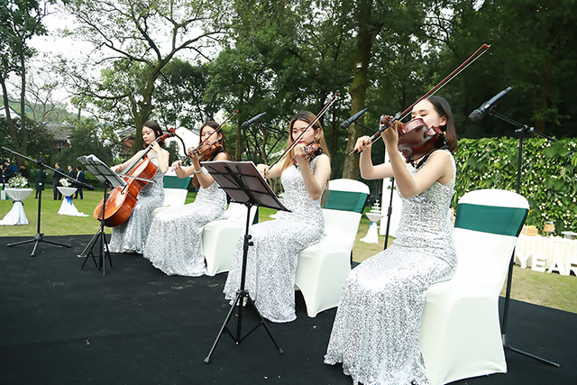 Along with the beautiful string music begins the lawn ceremony. Mr. Zhen Wen, Board Chairman, and Mr. Lin Longhai, Vice General Manager, break out the champagne to celebrate this special day. Guests and employees merrily gather together and enjoy the beautiful scenery.
