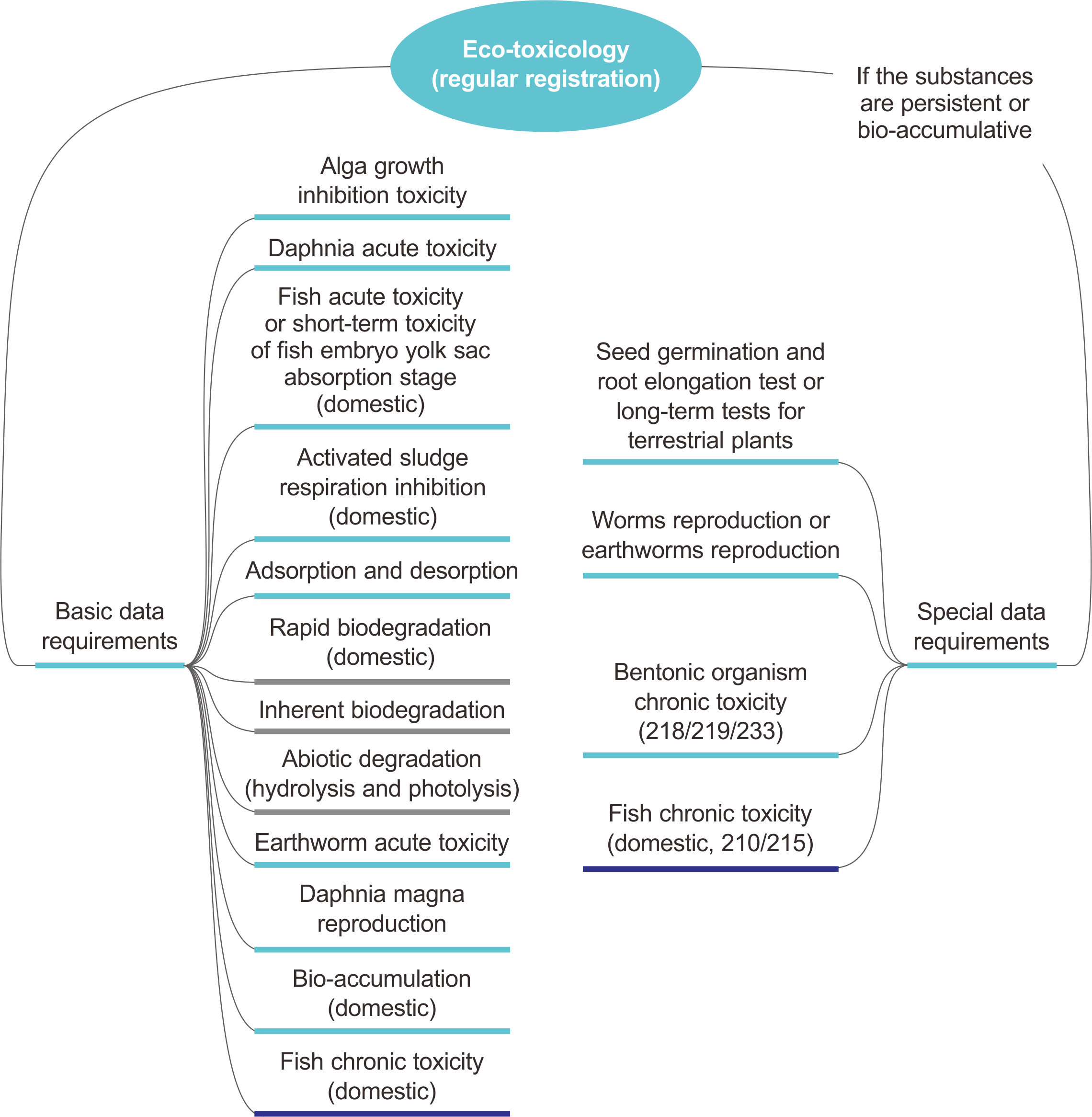 - Simplified Registration (1 t/a or more, yet less than 10t/a): Basic data includes physicochemical properties, persistence, bio-accumulation and acute toxicity of aquatic environment; If the substances are considered persistent and bio-accumulative, then additional data for chronic toxicity of aquatic environment is also required.