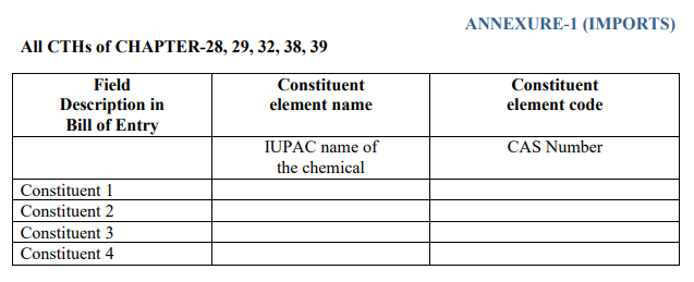 Imports: Imported products prescribed under chapters 28, 29, 32, 38, and 39 of the Customs Tariff Act, 1975, (including inorganic chemicals; precious metals; rare earth metals; organic or inorganic compounds of radioactive elements or isotopes; organic chemicals; tanned or dyed extracts; tannins and their derivatives; dyes, pigments, and other colorants; paints and varnishes; putty and other adhesives; ink; miscellaneous chemical products; plastics and their products). The International Union of Pure and Applied Chemistry (IUPAC) name and CAS number of chemicals must be provided in the declaration.