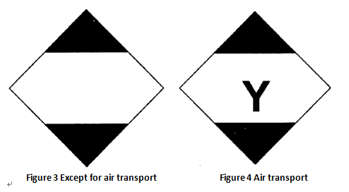 Except for air transport, packages containing dangerous goods in limited quantities need not be labeled nor marked with the normal shipping name or UN number of the contents, but should bear the marking shown in Figure 3 below. Packaged in limited quantities of dangerous goods consigned for air transport should bear the marking shown in Figure 4 below.