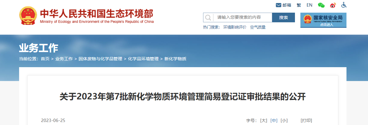 On June 25, 2023, China's Ministry of Ecology and Environment (MEE) released the approval results of the seventh batch of simplified registrations of new chemical substances in 2023.