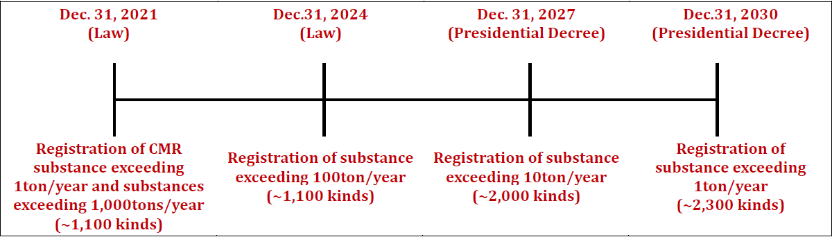 - Existing chemicals data should be registered by 2030 according to its volume and hazard of chemicals in order to obtain and manage hazardous information of the chemicals circulated in Korea.
