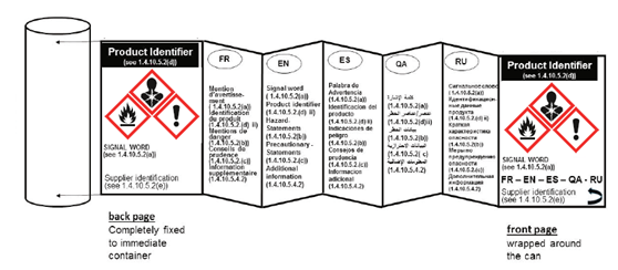 Fold-out labels include front page, text page and back page. The front page should contain at least: product identifier, hazard pictogram(s), signal word and supplier identification. A symbol to inform the user that the label can be opened to illustrate that additional information is available on inside pages is also required. The text page should contain: product identifier (including hazardous components contributing to the classification), signal word, hazard statements, precautionary statements and other information (such as directions for use and information required by other regulations). If more than one language is used on the fold-out label, the country codes or language codes are required. The back page should contain: product identifier, hazard pictogram(s), signal word and supplier identification.