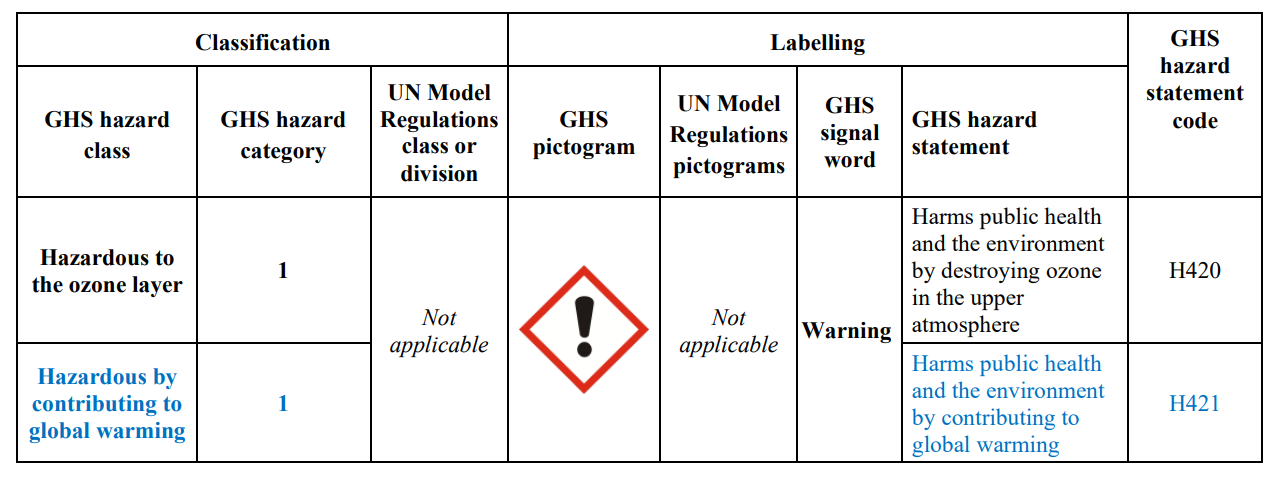 During the 44th Session of the Sub-Committee of Experts on the Globally Harmonized System of Classification and Labelling of Chemicals, Austria, the EU, Finland, Germany, and the UK proposed revising Chapter 4.2 by adding the new hazard category related to global warming listed in the annexes to the Montreal Protocol. If the proposal is approved, the new classifications would be Hazardous to the Atmospheric System, which encompass both: