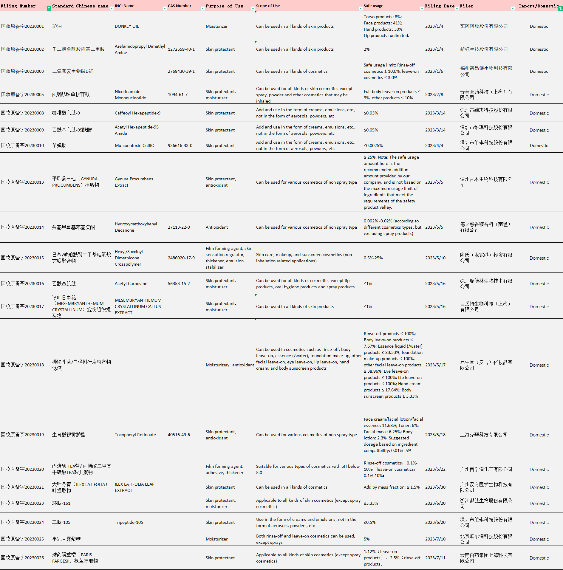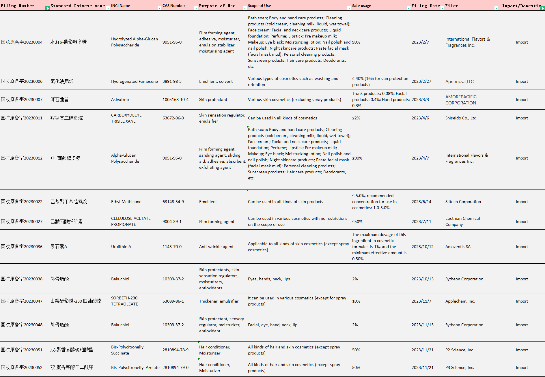 Table 2 Filing info of imported new cosmetic ingredients in 2023
