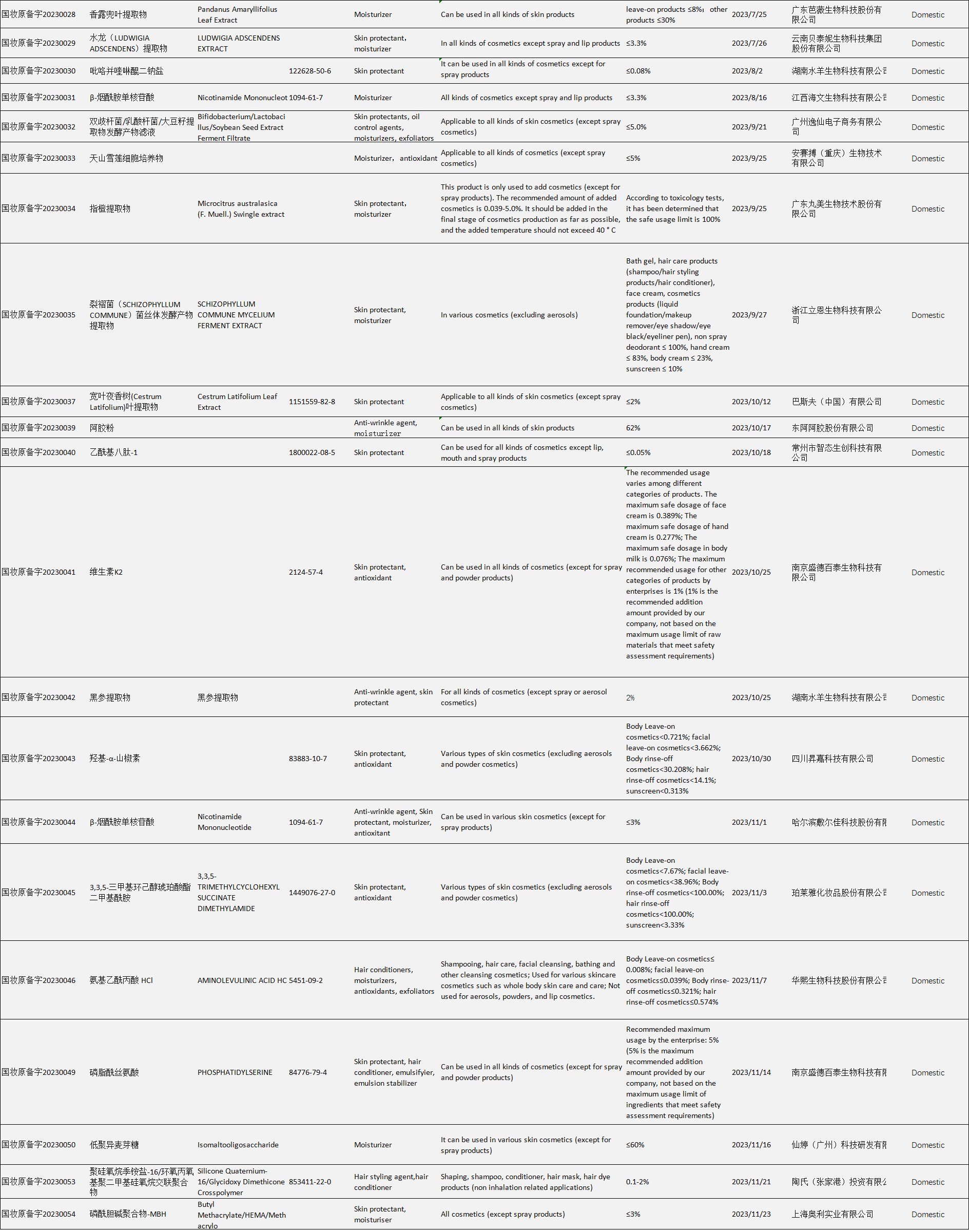 Table 1 Filing Info of Domestic New Cosmetic Ingredients in 2023